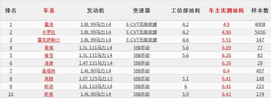 排名第4和第5的是本田旗下的哥瑞和锋范,而且都是手动挡车型,看来在同等排量下,还是手动型最省油。排名第6和第7的分别是大众旗下的大众凌渡和大众桑塔纳,他们的油耗也是非常的可观,仅仅只有6.4L/百公里。排名第8位的是别克英朗,1.0T 6挡手动型车型油耗仅为6.41L,但是要比工信部的5.1L高出了1.31L!排名第9 和第10位的是斯柯达旗下的昕动和昕锐,他们俩的油耗与工信部的油耗还比较靠谱,误差不算太大。