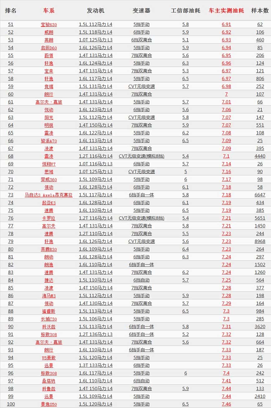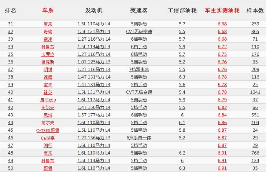 最近比较畅销的日产-轩逸,它的真实油耗和工信部的油耗相差不大,百公里6.59L的油耗排名第21位,看来日产的发动机热效率确实比不过丰田和本田。大众朗逸排名第23位,它的1.6L排量5挡手动型,油耗为6.61L,在统计别车型中这个油耗也算是比较可观的了。国产神车宝骏-310W,仅仅排名第27位,相信很多人都会说这个排名也是可以的了,但是你不要忘了,它的这款车的排量只有1.2L~大众高尔夫排名第29位,蓝鸟排名第30位。