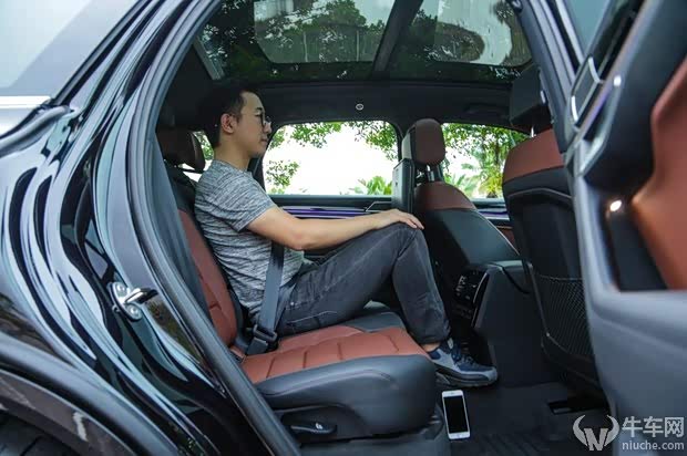 体验者身高为173cm,在前排以及后排的乘坐空间上都有着不错得表现,上文也说到全新途锐在轴距方面有所增加,这也为后排带来了更为宽裕的腿部空间。全景天窗一直延续到后排乘客头部的正后方,宽敞的空间、较大的采光面积以及后排的空调座椅等一系列配置,总的来说,还是相当舒适的。不过,从这个价位来看,有如此的配置也就无可厚非了。