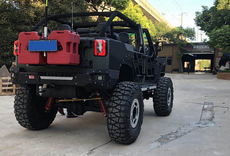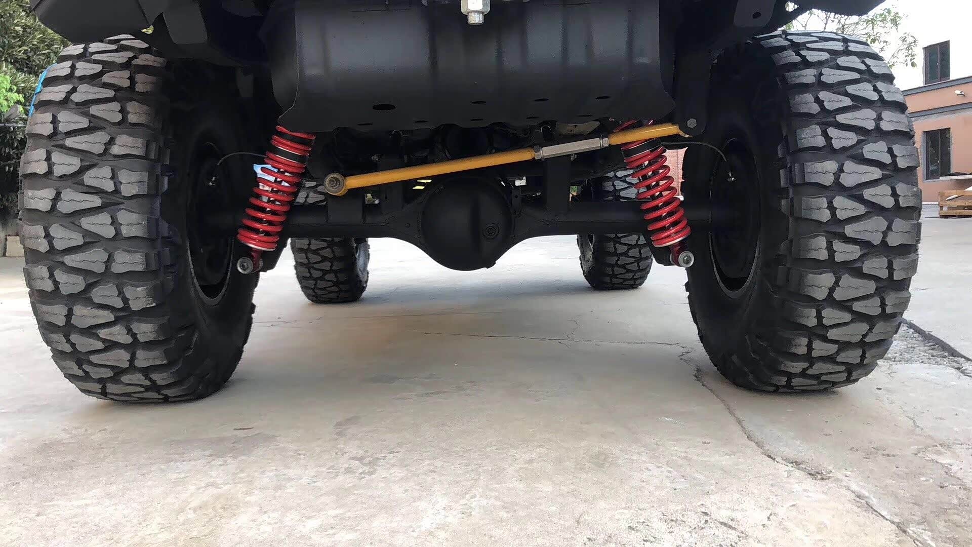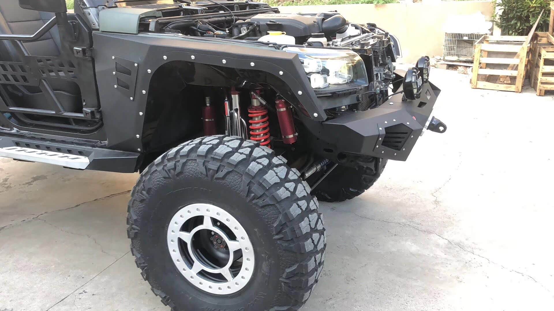 整车增高了后,用上了定制的毒蜘蛛防脱圈17寸轮毂搭配日东龙爪40 13.5 R17的轮胎,并把前后杠、轮眉、侧踏都装上了一整套的铠甲。