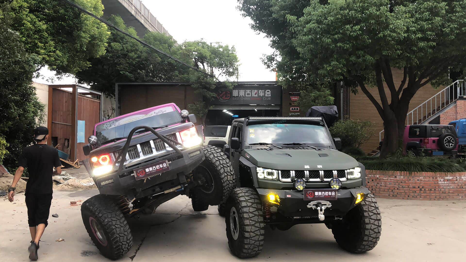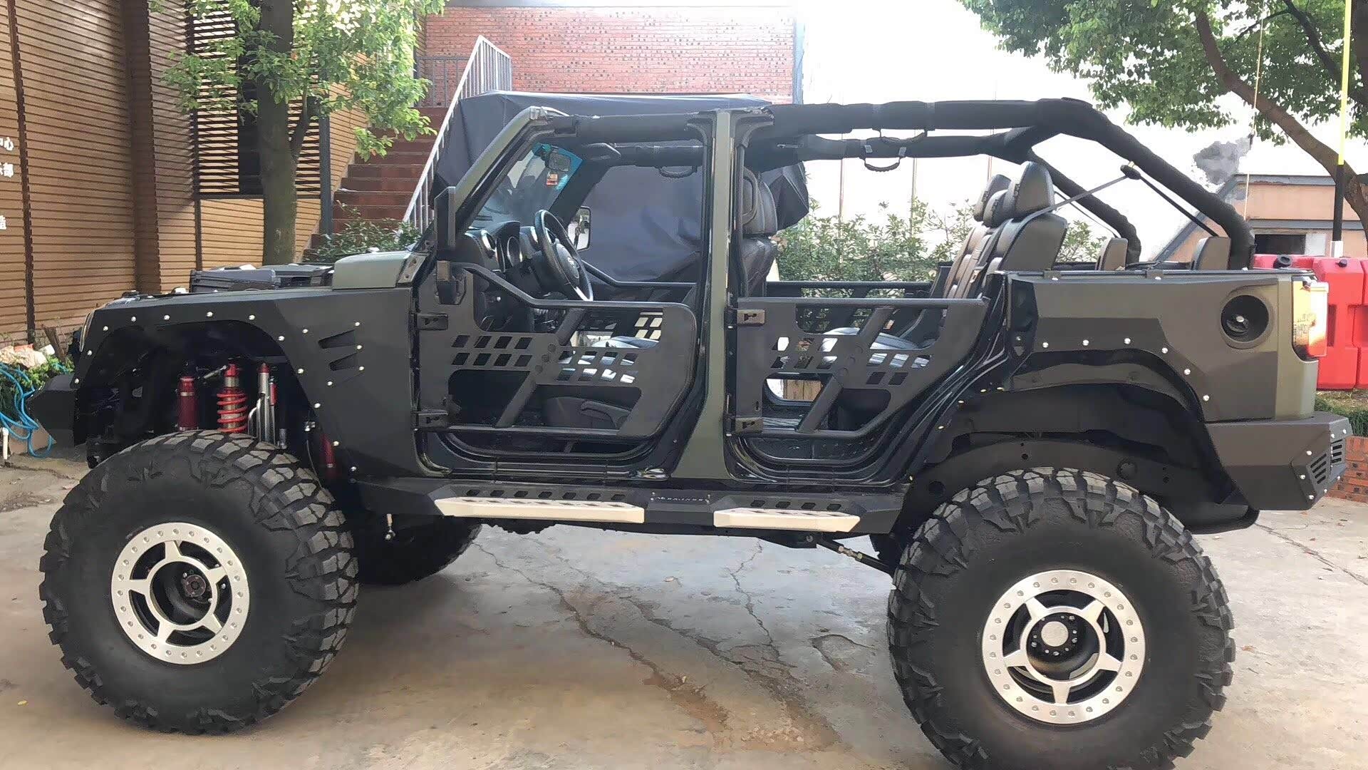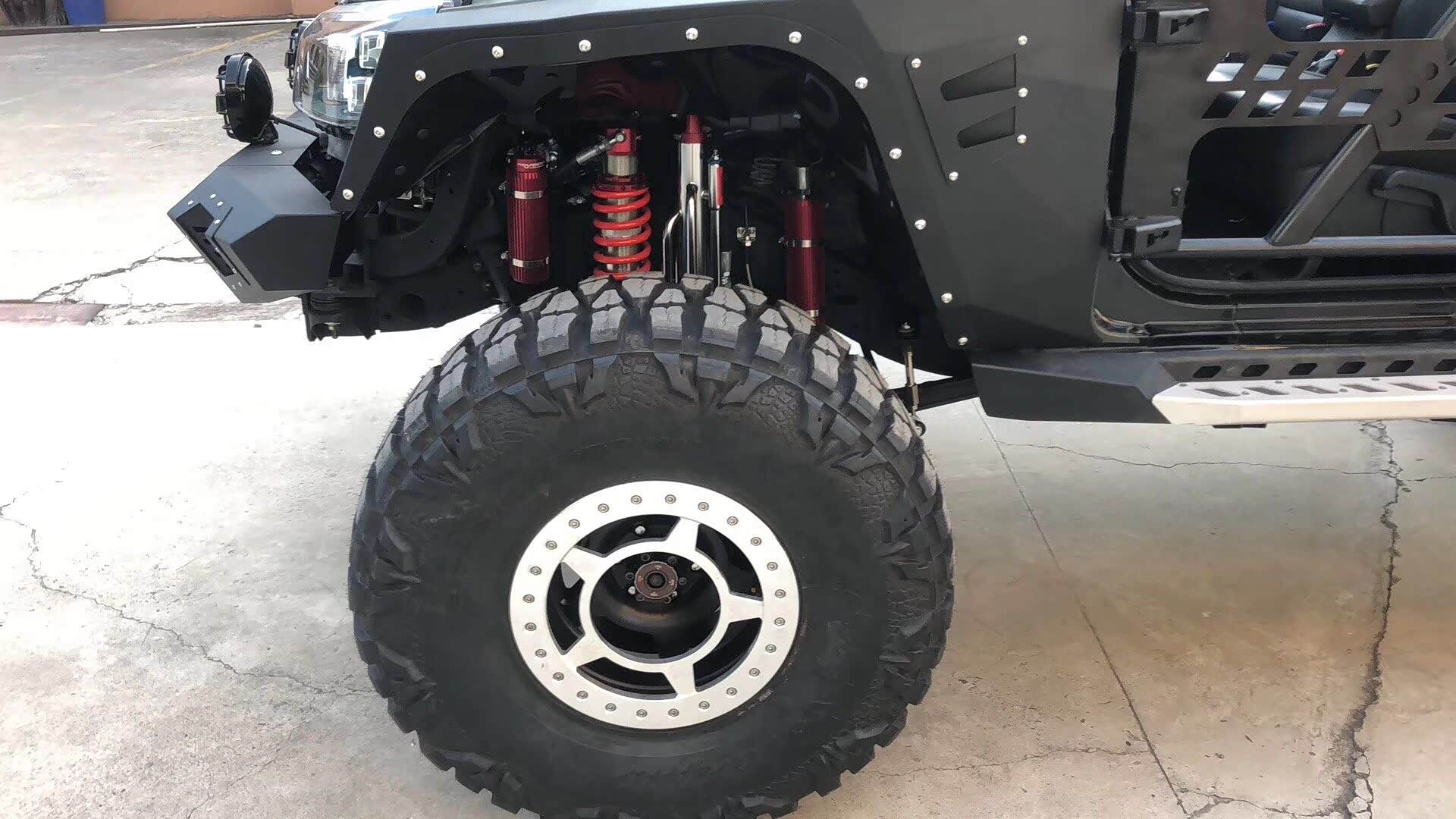 整车增高了后,用上了定制的毒蜘蛛防脱圈17寸轮毂搭配日东龙爪40 13.5 R17的轮胎,并把前后杠、轮眉、侧踏都装上了一整套的铠甲。