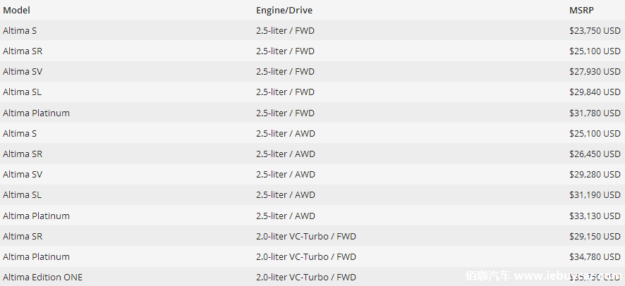 【佰咖汽车·海外新车资讯】近日,日产公布了2019款Altima的官方价格。现在,入门级前轮驱动的S型号售价为23,750美元,而2018款的售价为23,260美元。而最便宜的四轮驱动版本,Altima S售价为25,100美元。