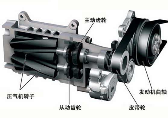 其实,最早的增压器都是机械增压,机械增压器直接利用引擎出力来驱动增压器,再将高密度空气送入汽缸内以提高引擎的输出功率。机械增压则被称为Mechanical Supercharger,简称为Supercharger。
