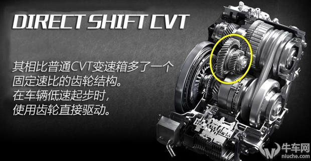 这台CVT变速箱最大的特点就是相比普通CVT多了一个固定速比的齿轮结构,你可以理解为它多了一个“1挡”,也就是说在起步阶段,动力是由那独立的1档齿轮直接连接到车轮上,不用到担心钢带会有打滑的现象,动力输出自然也就更直接。这台CVT变速箱可以说继承了传统CVT的平顺性,同时也避免了CVT初段动力绵软的现象。