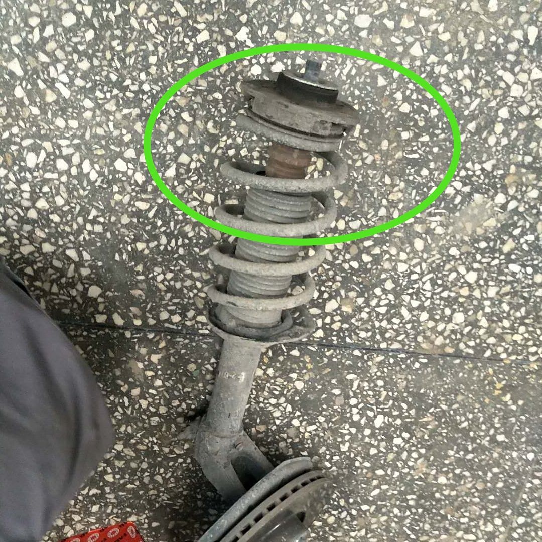 下图所示,师傅已经把减震器和与之连接的转向节一起给拆了下来。绿色区域所示,这个零件就是减震顶胶,它下面的压力轴承也需要更换。
