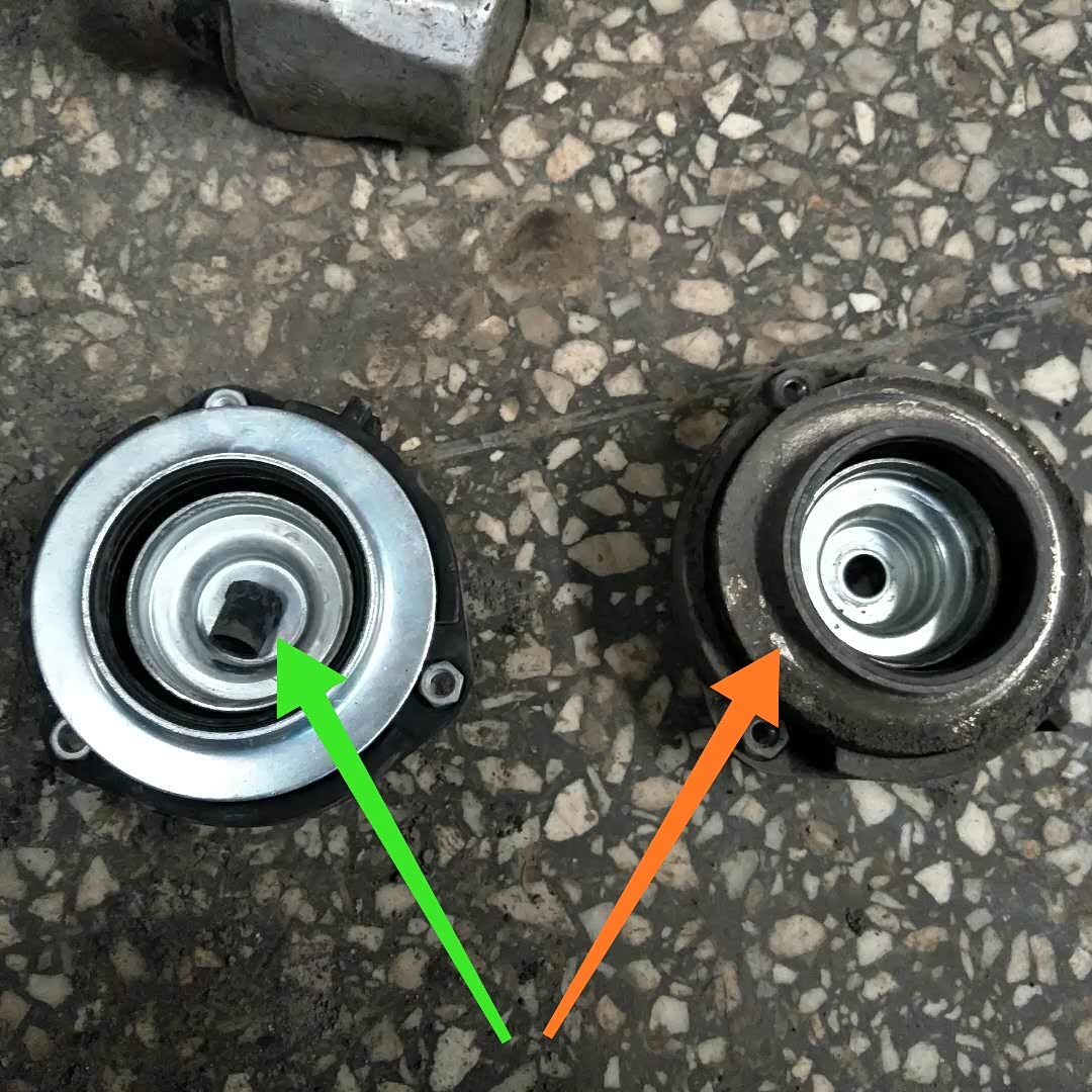 下图绿色箭头所示,这是新的减震顶胶;橙色箭头所示,这是旧的减震顶胶。它损坏是因为内部的橡胶套变形严重,行驶在不平路面就会出现异响。