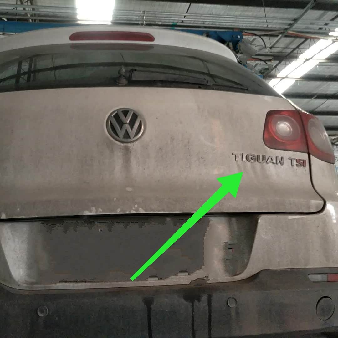 下图箭头所示,途观的车尾。它配置的是1.8排量涡轮增压发动机。师傅介绍,这辆途观的故障现象是行驶在不平路面有异响,原地打方向也有异响。检查出来的问题是下支臂球头和减震顶胶损坏。