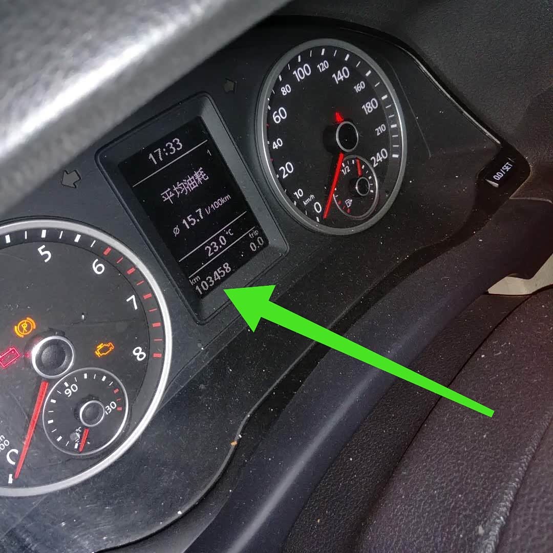 下图箭头所示,它的行驶里程有10万公里。途观车主说他平时开车的路况不是很好,底盘出现的异响已经持续很久了,这次是因为响声变大了,赶紧来维修。由于发动机怠速了很久,所以仪表显示的15升的油耗并不准确。