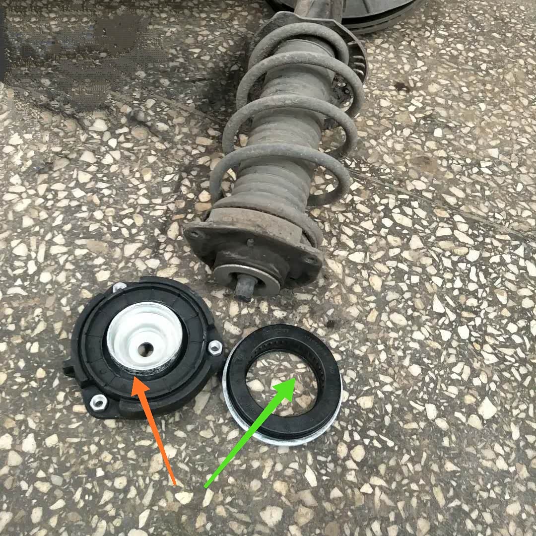 下图橙色箭头所示,这是减震顶胶;绿色箭头所示,这是压力轴承。压力轴承位于减震器和减震顶胶中间,打方向时,它就会转动。当如果我们原地打方向出现咯嘣的异响时,就是它有问题了。