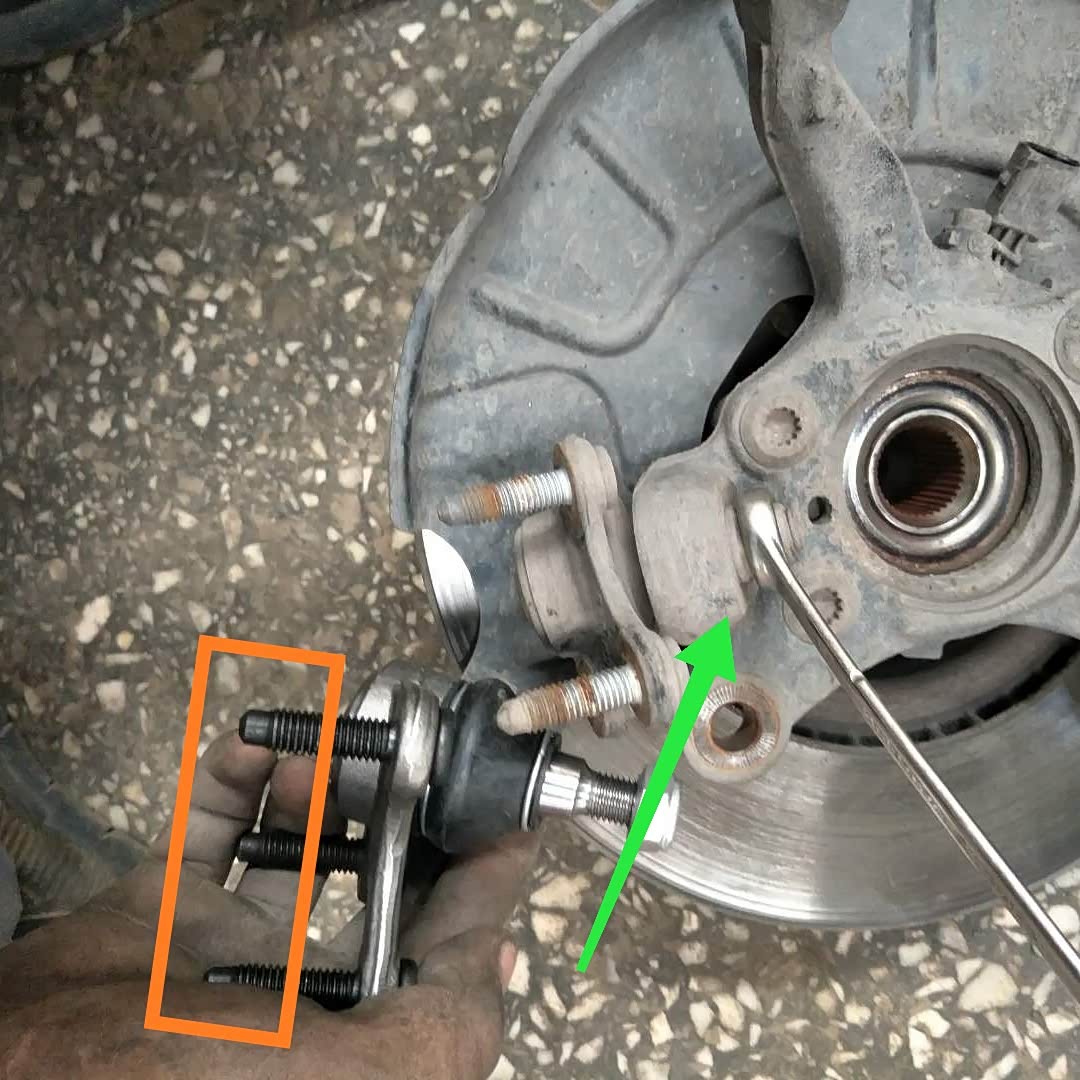 下图箭头所示,这是位于转向节下部的下支臂球头,它也是内部松旷,只有更换才可以。橙色区域所示,这是新的下支臂球头,这三条螺丝是在下支臂上面安装。有很多车的下支臂和球头是一体的,只有更换整个下支臂才行,而这辆途观的下支臂球头和下支臂是分开的,这比较好!