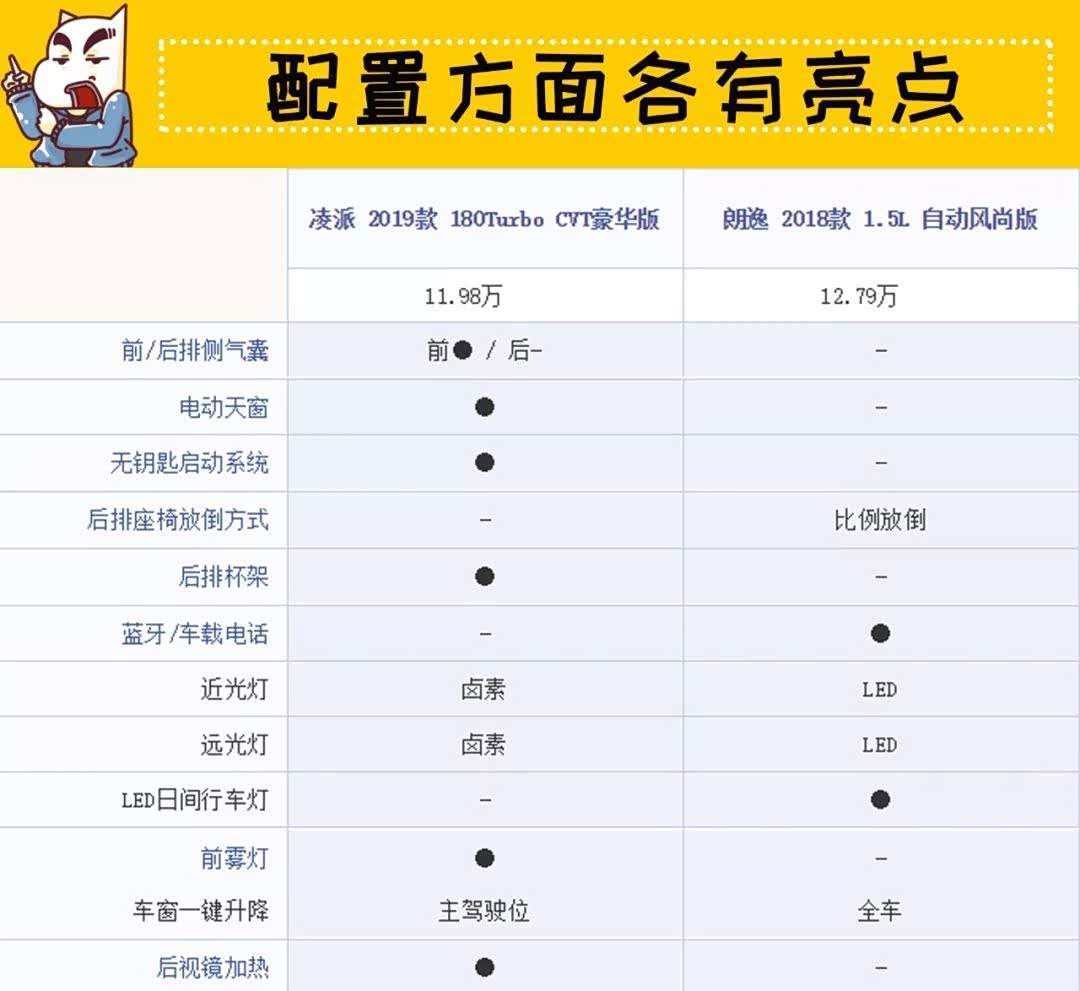除了空间之外,小白相信配置也是大家比较关心的部分,毕竟对于这个级别的消费者来说,更注重的是性价比。小白在两款车型里各自选取了一款配置进行对比,能够看到凌派在配置上多出了前排侧气囊、电动天窗、后排杯架以及前雾灯等。而朗逸则是多了蓝牙连接、LED远近光灯、LED日间行车灯和全车车窗一键升降。
