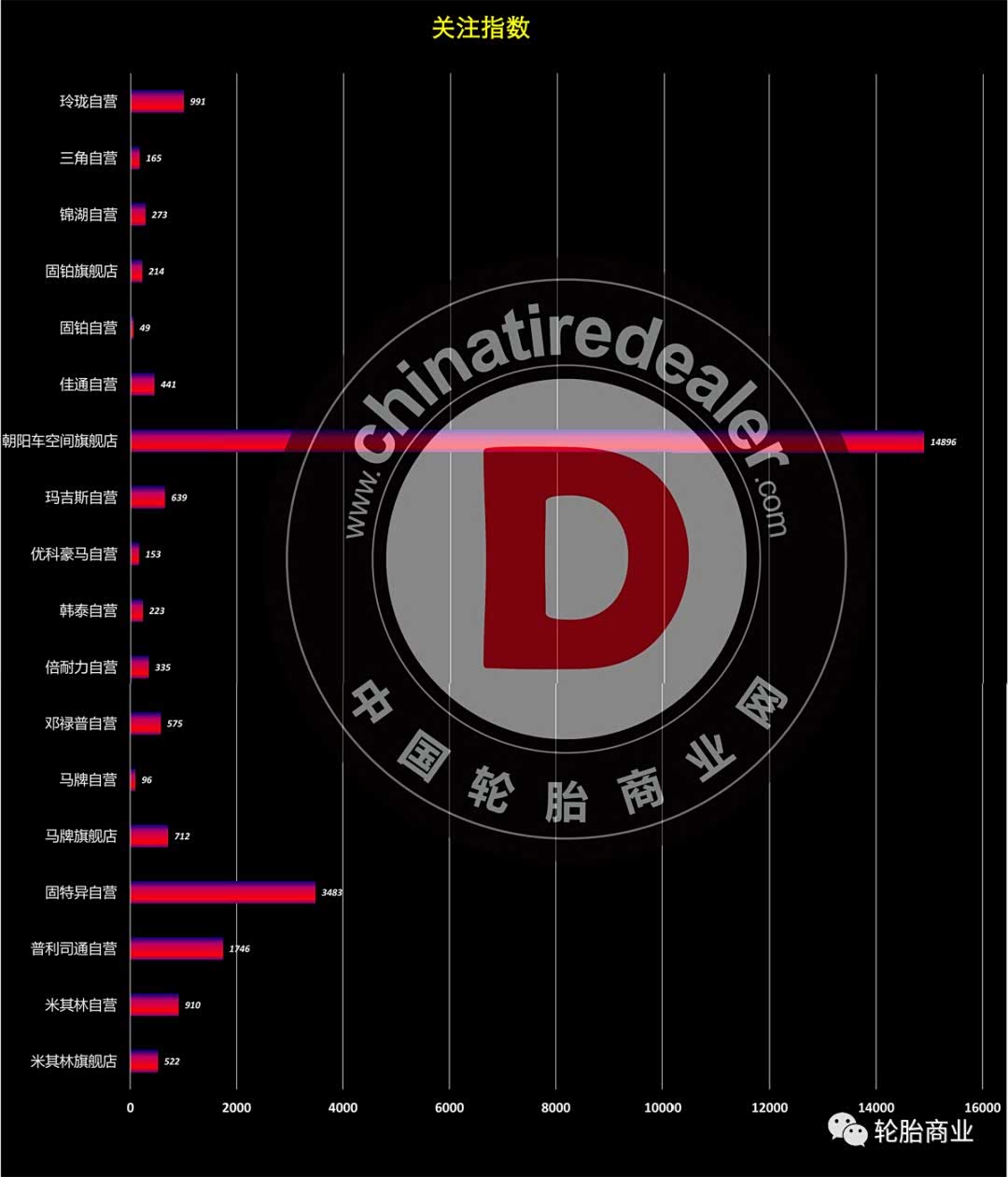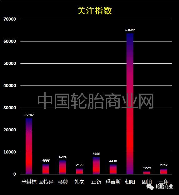 关注指数在一定程度上反映了网购轮胎消费者对于品牌的认可程度,朝阳以绝对优势位列第一,随后是米其林和正新。朝阳也是这些品牌里最早开设旗舰店的轮胎品牌。