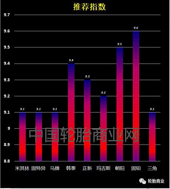 推荐指数方面,固铂以9.6分高居第一,紧随其后的是朝阳和韩泰,米其林、固特异、马牌这些传统豪强并没有获得很高的推荐指数。
