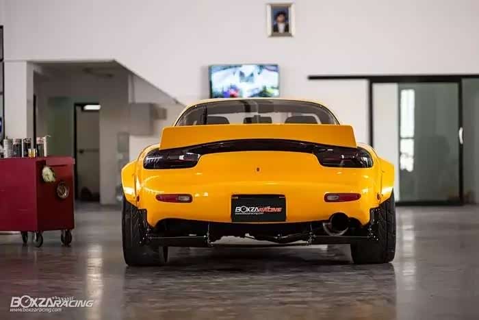 这辆Mad Mike所驾驶的这辆RX-7/RX-3,是出自于Pandem所推出的FD3S Boss Kit,适用于后期款的FD3S RX-7。而这辆来自于泰国的RX-7,也是受到了Mad Mike的感召选用了该组套件。这组套件包含引擎盖、水箱罩灯组总成、左右宽体叶子板、侧裙,以及70年代经典的前铲下巴跟Pandem经典的鸭尾尾翼。