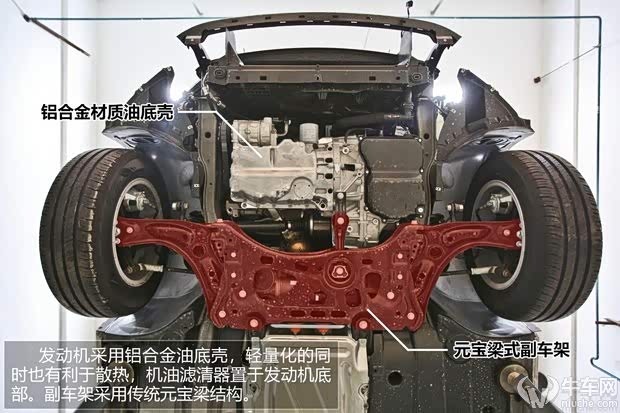 发动机采用铝合金油底壳,轻量化的同时也有利于散热,机油滤清器置于发动机底部。副车架采用传统元宝梁结构,并未出现铝合金组件。