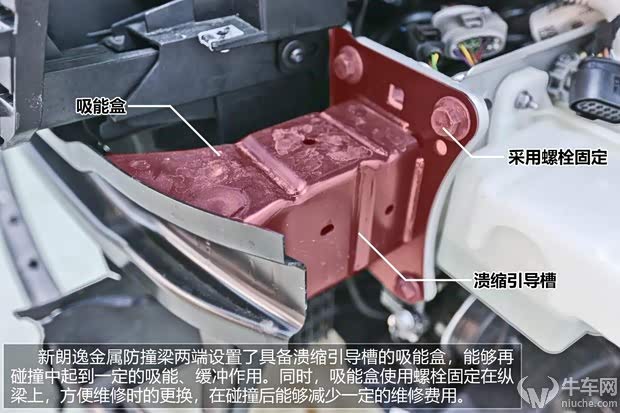 新朗逸金属防撞梁两端设置了具备溃缩引导槽的吸能盒,吸能盒本身抗压能力较弱,会在发生碰撞时通过自身形变对撞击力进行缓冲和吸收,避免车身纵梁受损变形,减少碰撞后的维修费用,而溃缩引导槽能够保证吸能盒的形变处于吸能效果最佳的形变范围内。此外,新朗逸吸能盒通过螺栓与纵梁连接,方便碰撞后的维修,一定程度上减少了维修费用和工时。