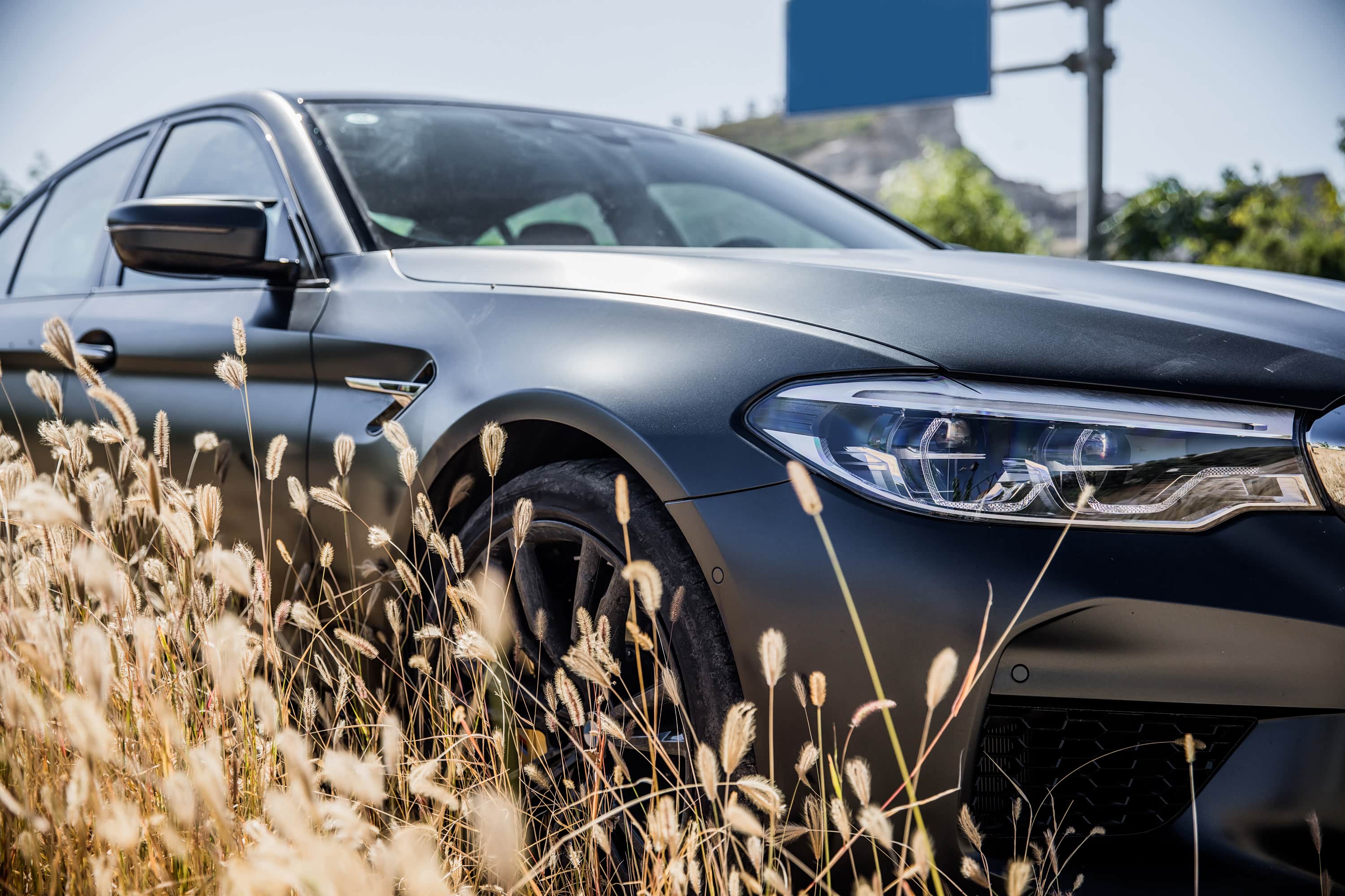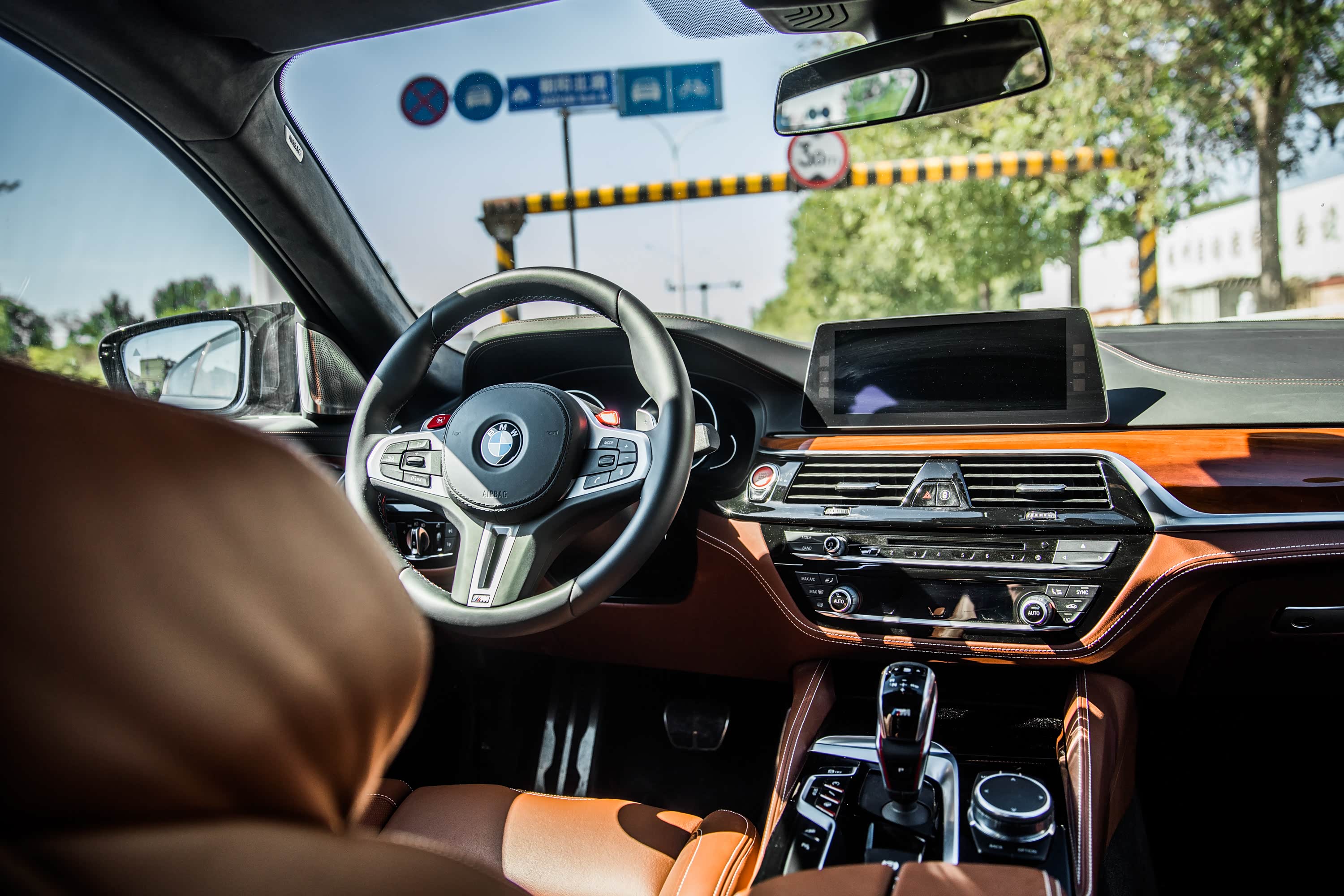 应该说,M5从外观上还是延续了5系的基本特征。开眼角的头灯采用LED光源,并且搭载了随动转向功能以及自适应远光灯系统。当然,在国内一些道路上夜间行驶的话,我们可能还是最好关闭这个自适应系统,好用更强烈的光线提醒对向远光大开的司机。而M5最为独特的,就是两边加入了导风设计的反光镜。这个反光镜远看像是跟车身相连,实际上则是镜内缘多了道导风条,像是给反光镜戴上一顶小帽子。轮圈是M5彰显独特身份的重要一环。纯黑色的轮圈看起来杀气腾腾,20英寸的大小则并不是特别夸张。真正让人兴奋的是轮圈中巨大的刹车盘和卡钳。这套前后通风盘式的制动系统,能让标准版M5在100-0km/h制动下达到夸张的33米,这无疑是一个非常漂亮的数据。