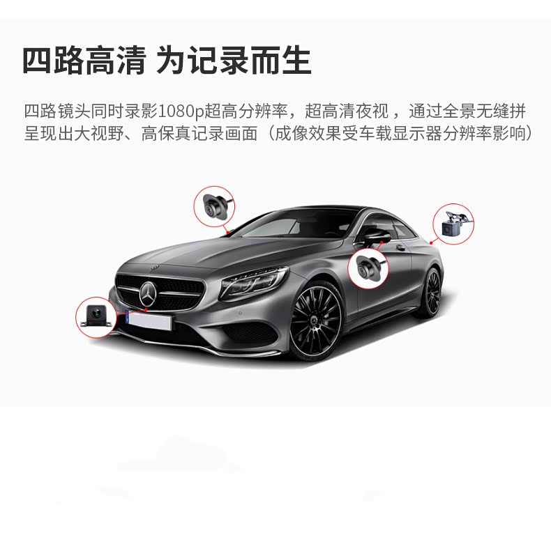 在行车过程中,4只摄像头也是同时不间断工作的,也就是行车时前、后、左、右四个方向的情况都会被完整记录下来。同时车内的显示屏也是同时显示4个方向的影像.