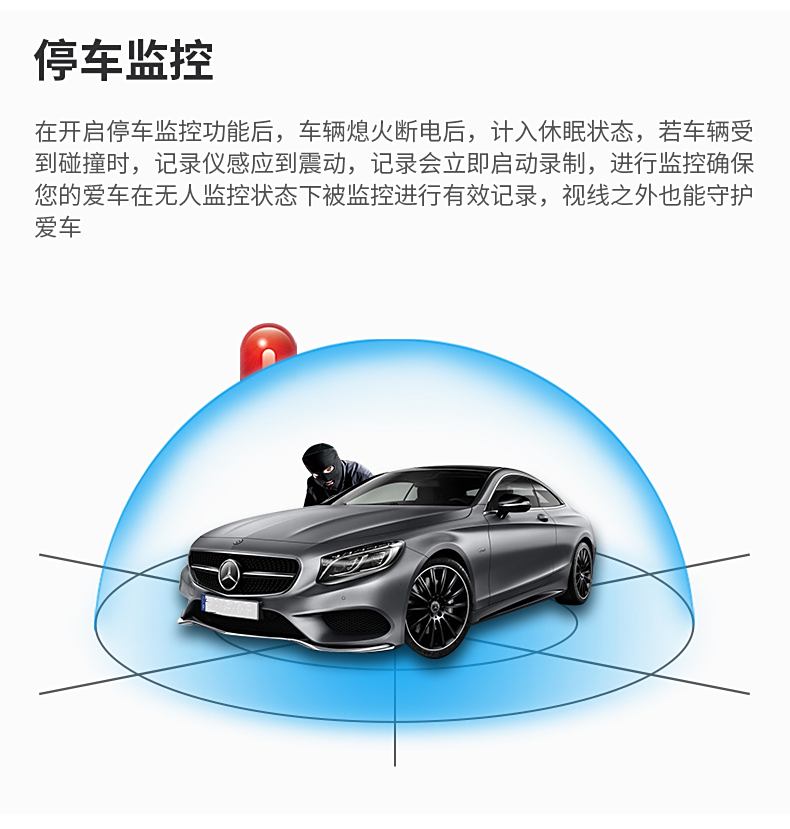 在开启停车监控功能以后,车辆熄火断电后,计入休眠状态,若车辆受到碰撞时,记录仪感受到震动,记录会立即启动录制,进行监控确保您的爱车在无人监控的状态下被监控进行有效记录,视线之外也能守护爱车。