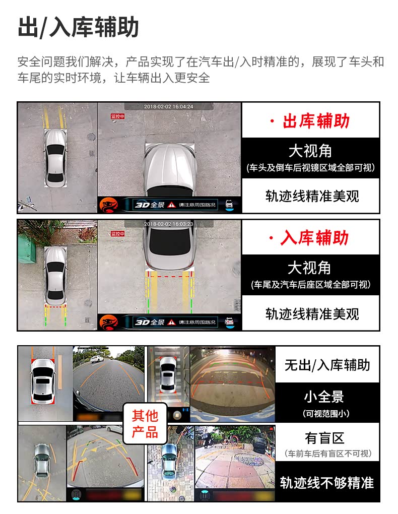 安全问题我们解决,产品实现了在汽车出/入时精准的展现就车头和车尾的实时环境,让车辆出入更让安全