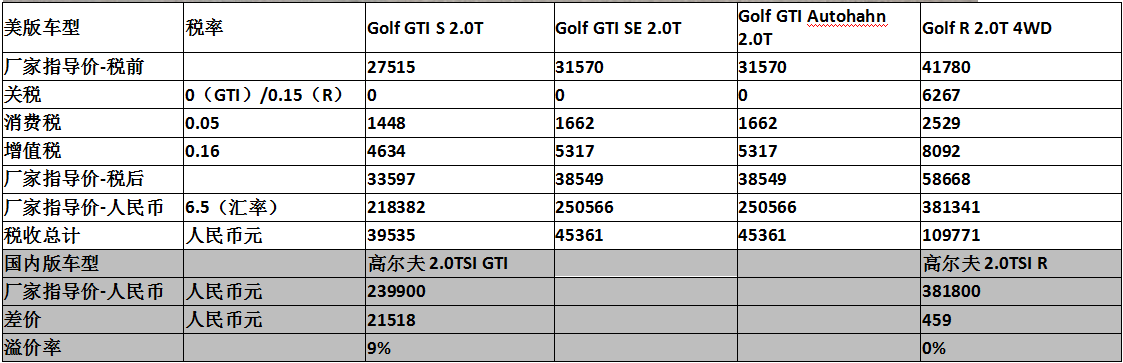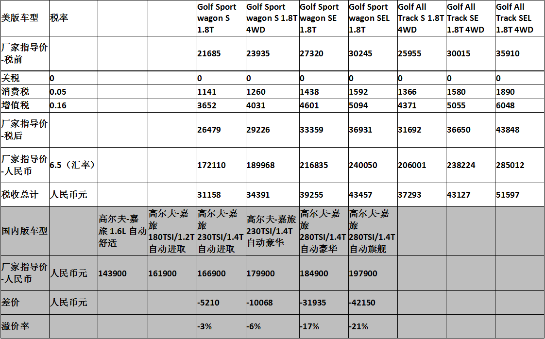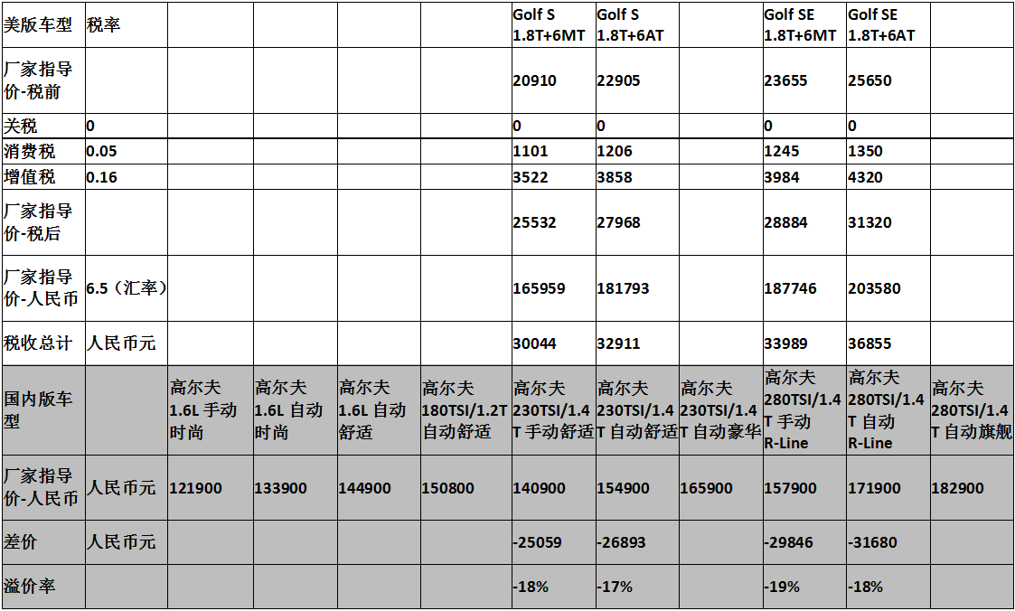 由上可见,大众高尔夫的价格低于美版同类车型,平均溢价率在-18%左右。在不考虑动力系统简配的前提下,国内版高尔夫的定价还是合理的。虽然各种1.6L、1.2T和1.4T低功率发动机占据着国内高尔夫销量的主流,但是1.4T车型-18%的溢价率,还是反映出国产化对于降低汽车成本的好处。