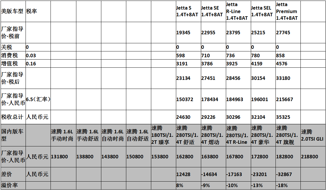由上可见,大众速腾的价格低于美版同类车型,但是低配车型的溢价率高,高配车型的溢价率低。舒适版的溢价率为+8%,到了高配的旗舰版,溢价率就变成了-18%。由此可见,速腾整体的定价较为靠谱,但是利用低配车型的高销量获取额外的利润也是不争的事实。