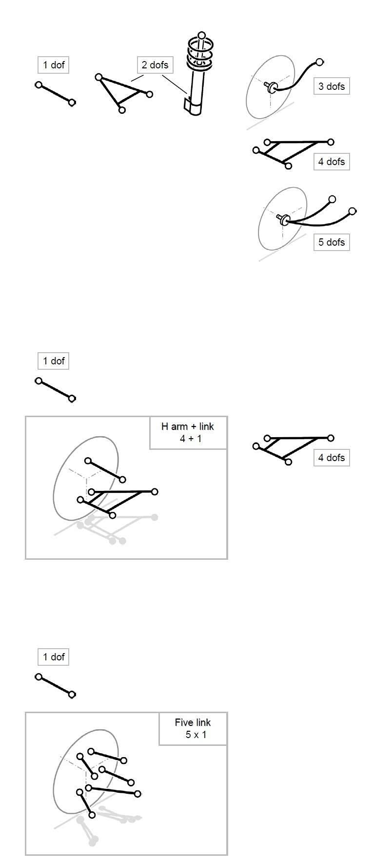 上下A臂各约束2个自由度x2+转向拉杆约束1个自由度=5个自由度(有时把下面A臂拆成2个连杆例如奔驰或者上下A臂都拆例如奥迪)