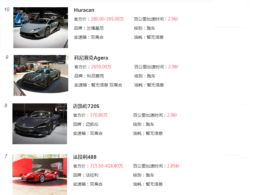 结语:以上就是全球10大“百公里加速”最快车型,前三名让人有些意外,法拉利却仅仅排名第七!