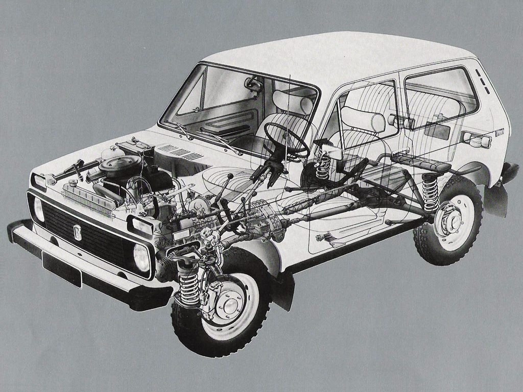 这辆车还有一个独特的地方,和很多硬派越野车不同,拉达涅瓦是承载式车身,也就是说它并没有大梁。近年来,路虎的越野车和三菱帕杰罗也都取消了大梁,改用承载式车身。越野车大梁的作用是用自身的形变来吸收路面的冲击,以防止冲击直接传递到车身。没有大梁的越野车,一般用的是特制车身,比如路虎揽胜和帕杰罗,它们的车身强度比普通车型强很多倍。而拉达涅瓦,不知道有没有加强车身。不过这种经典越野车,大件已经久经考验了。