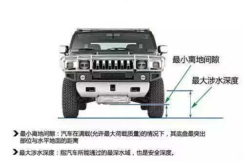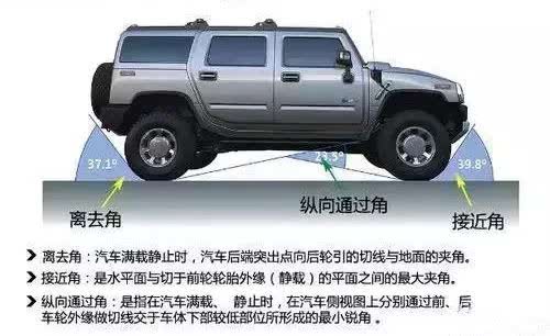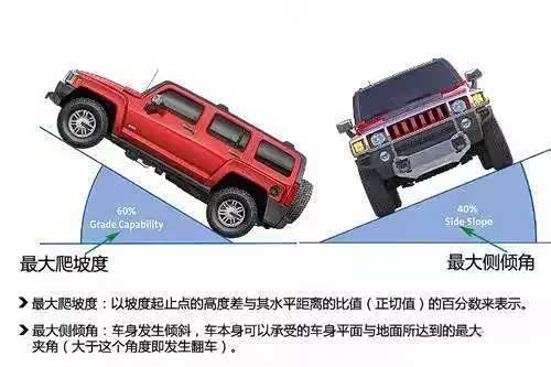 在了解一款SUV时,会经常看到一系列的参数,如最大爬坡度、最大侧倾角、最小离地间隙等等。可以从图中来了解这些参数的含义。