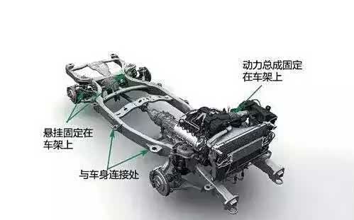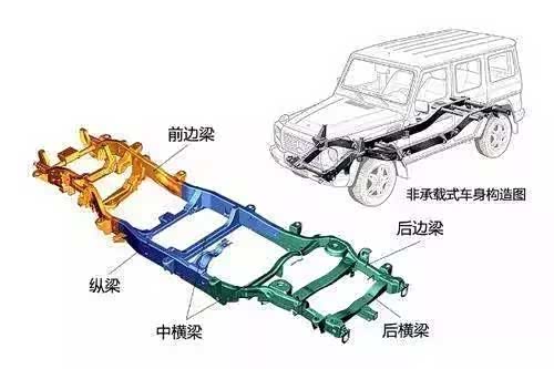 采用非承载式车身的汽车,其发动机、传动系统、车身的总成部分是固定在一个刚性车架上,车架通过前后悬挂装置与车轮相连。