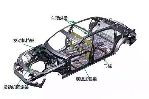 承载式车身汽车的整个车身是为一体的,没有贯穿整体的大梁,发动机、传动系统、前后悬挂等部件都装配到车身上,车身负载通过悬挂装置传给车轮。