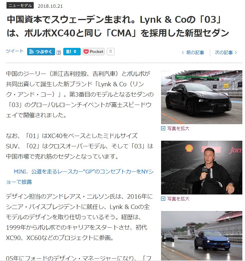 日媒标题:《中国资本在瑞典孕育与沃尔沃XC40同平台的新型轿车领克03》