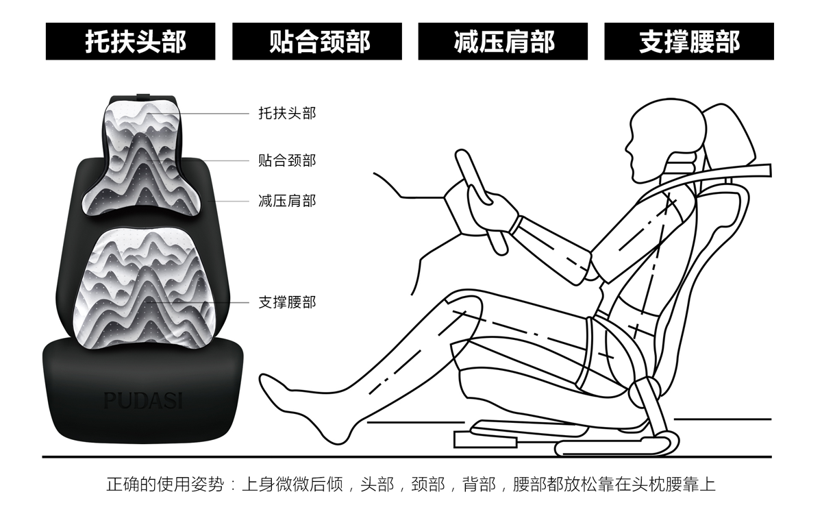 像普达斯PUDASI这种厚度就是刚刚好的,由国际著名产品设计师亲自操刀,以人体工程学为原理,提出头颈肩“三护合一”的呵护方式,不管是厚度还是弹性,都经过上万次测试,是真正适合中国人体型的汽车内饰用品。