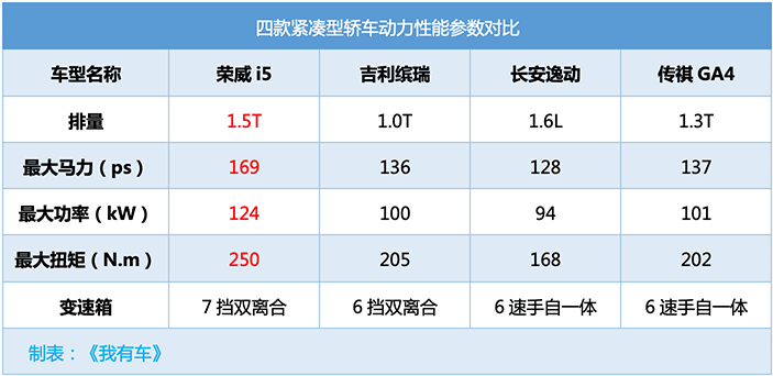 荣威i5更令人出乎意料的,还在于其提供1.5T+7速双离合变速箱的动力组合,这套动力总成我们并不陌生,名爵HS、名爵6、锐腾、荣威RX5、i6等车型均有提供,其1.5T发动机最大功率169马力(124kW),峰值扭矩250牛-米。荣威将此1.5T发动机下放至i5,这一做法着实要震慑到其余对手,要知道长安逸动全系只提供1.6L发动机、传祺亦未为GA4匹配1.5T发动机,显然荣威i5的动力优势要抛离竞品一大截。