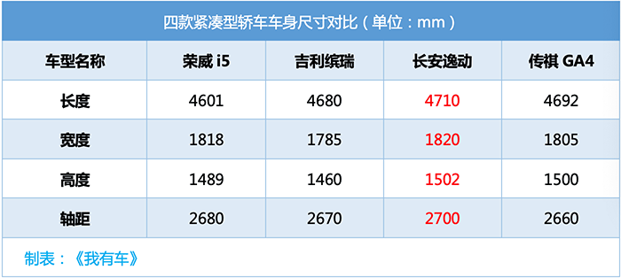 由于荣威i5针对的目标人群大多是首次购车或刚成立家庭的年轻用户,所以新车特意在空间方面留足余量,其长宽高4601x1818x1489mm,轴距2680mm,尤其车身高度比荣威i6还高了29mm,宽度和轴距同样要超过吉利缤瑞和传祺GA4,这或许能使新车更容易得到用户青睐。