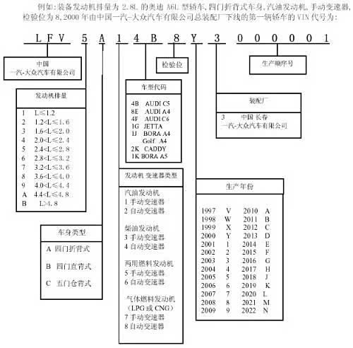 所有品牌汽车的VIN码都符合这个基本结构,但是在具体含义设计上每个品牌都会有自己的考虑各不相同,比如下面奥迪的VIN码
