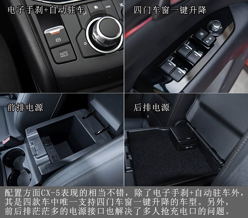 CX-5在配置层面拿出了十足的诚意,不论是安全配置还是实用性配置都可谓非常出色。例如LED大灯、前后倒车雷达、电动后备箱、座椅记忆、座椅加热、后排座椅靠背角度调节以及四门车窗一键升降等配置都是其独有,凸显满满的性价比。