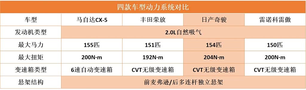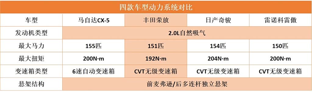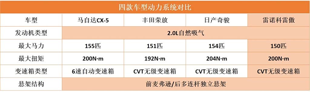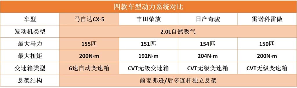 从上表横向对比可以发现,这四台发动机参数并没有拉开差距,但得益于6速自动变速箱以及马自达出色的调校,CX-5的确在这四款车中拥有更为出色的驾驶感受。