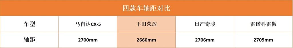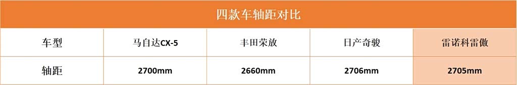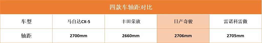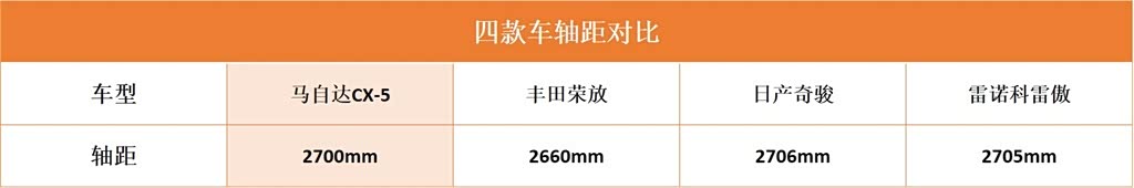 从上表数据看, CX-5的轴距与奇骏和科雷傲几乎一致,这也保证了其足够的后排腿部空间。