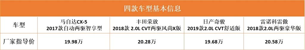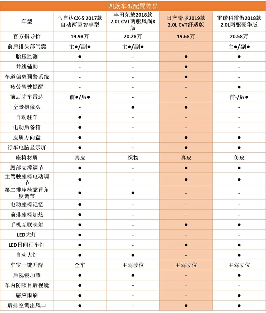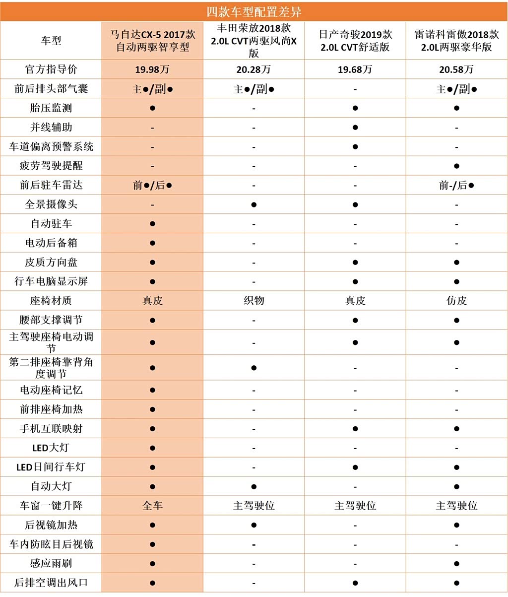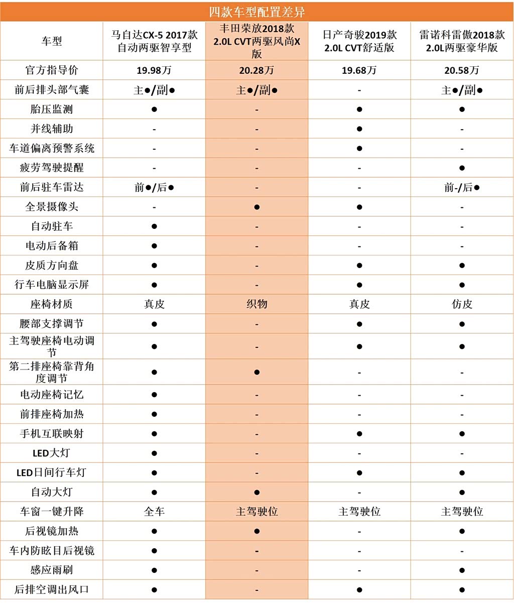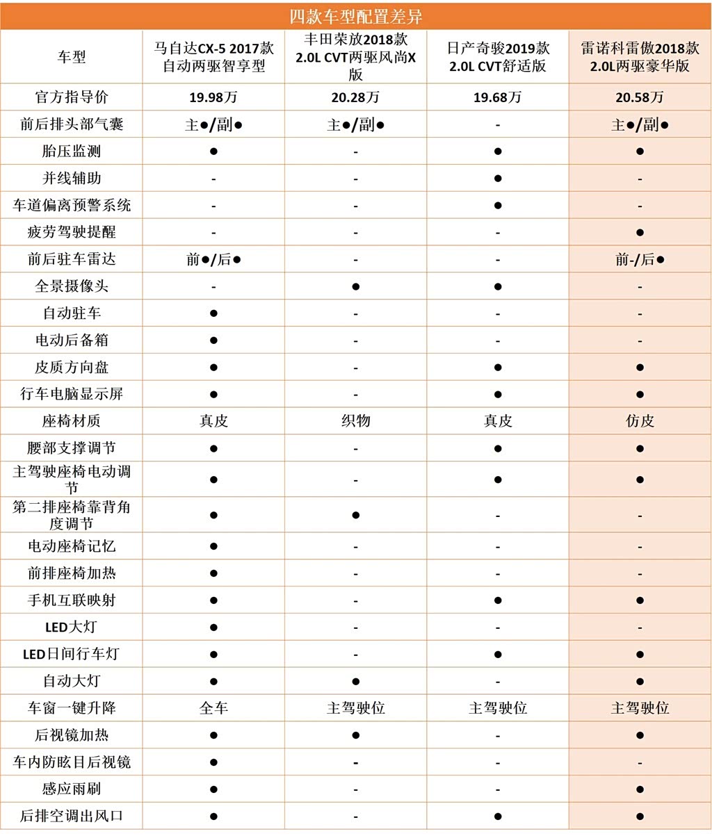 总结:四款车因为同属NA派而走到了一起,但却又展现出各自鲜明的个性。马自达CX-5在颜值当道的社会占了很大的便宜,而丰富的配置以及不错的内饰品质更是它吸引消费者的重要砝码;即将换代的荣放依然在发挥着余热。尽管设计与配置都难以适应当今消费者的需求,但出色的品质与口碑是它最大的背书;奇骏,它靠着尺寸独霸一方,在动力及配置方面的均衡表现都是它站稳脚跟的资本。而最后的科雷傲,它没有因为是法系血统而牺牲自己的性价比,个性是它最大的标签,配置也足够,只是在很多方面还需要中国消费者适应适应。至于选哪款,想必大家心中已经有了答案。
