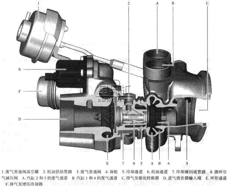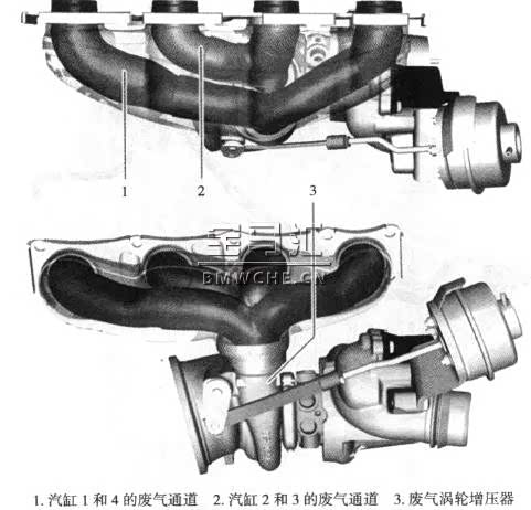 N20发动机装有两个采用 Twin ScroLL II技术的废气涡轮增压器,这种增压器在涡轮人口处有两个独立通道,可分别将两个汽缸的废气引至涡轮叶片处。N20发动机的废气涡轮增压器见下图。