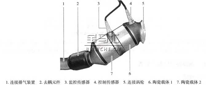 N20发动机采用带有两个陶瓷载体、靠近发动机的单管式催化转换器,见下图。