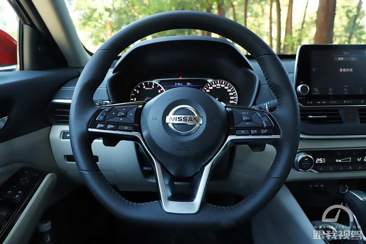 对于运动化风格上,首先就是握感相对不错的平底方向盘设计,造型看上去估计能增加“唇上5马力”,多功能按键赋予了它更强的实用性,基本上娱乐系统、仪表盘内容的操作以及语音控制都可以随时操作。除此之外,换挡拨片的增加也为天籁带来了些许的驾驶乐趣。