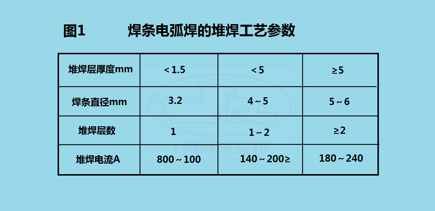 钛钙型、钛铁矿型、低氢型药皮的焊条最好采用直流反接进行堆焊,石墨型药皮的焊条堆焊以直流正接为宜,也可采用交流电源。堆焊前焊条应参考焊条说明书的规定温度进行烘干,一般酸性焊条150℃烘0.5~1h,碱性焊条250~350℃烘1~2h。堆焊的预热温度主要根据碳当量确定,如碳当量(%)是0.4、0.5、0.6、0.7、0.8,预热温度(℃)分别为:100、150、200、250、300。堆焊后的缓冷可在炉中或石棉中进行,也可适当加热来使其缓慢冷却。
