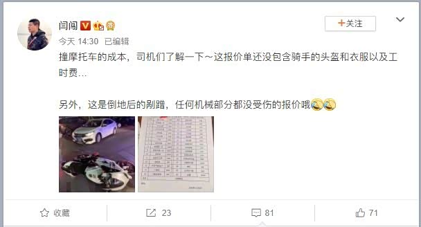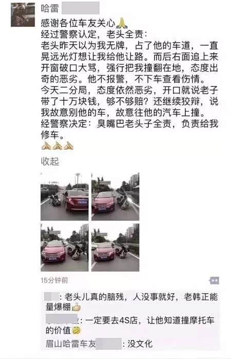 后来车友表示:开普通四轮的别轻易瞧不起骑两轮的了,不是你们想的那样简单;一定要让他跟着去4S店,让他知道撞摩托车的价值。