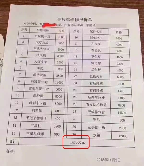 从该截图上来看,此次交通事故并没有造成重大的人员伤亡,仅仅是发生了一些剐蹭后,杜卡迪倒地。但这台杜卡迪的事故维修单却让很多人震惊了,报价竟高达14.33万元,而且这报价单还没有包含骑手的头盔和衣服以及工时费。于是有网友说:思域又撞出一辆思域