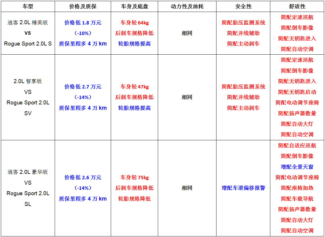 美版Rogue Sport 2.0L SV型与国内逍客2.0L智享版参数对比见下表: