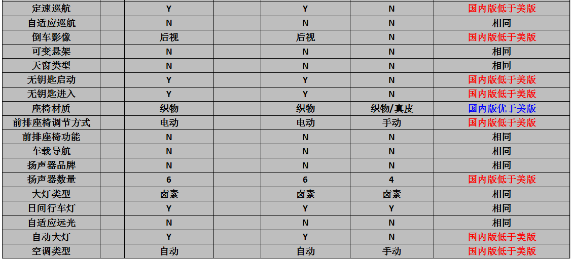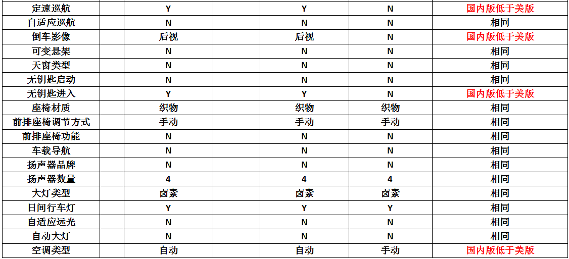 本次比较,美版一共6款车型,国内版一共9款车型,其对应关系见下表(阴影部分为本期对比车型):