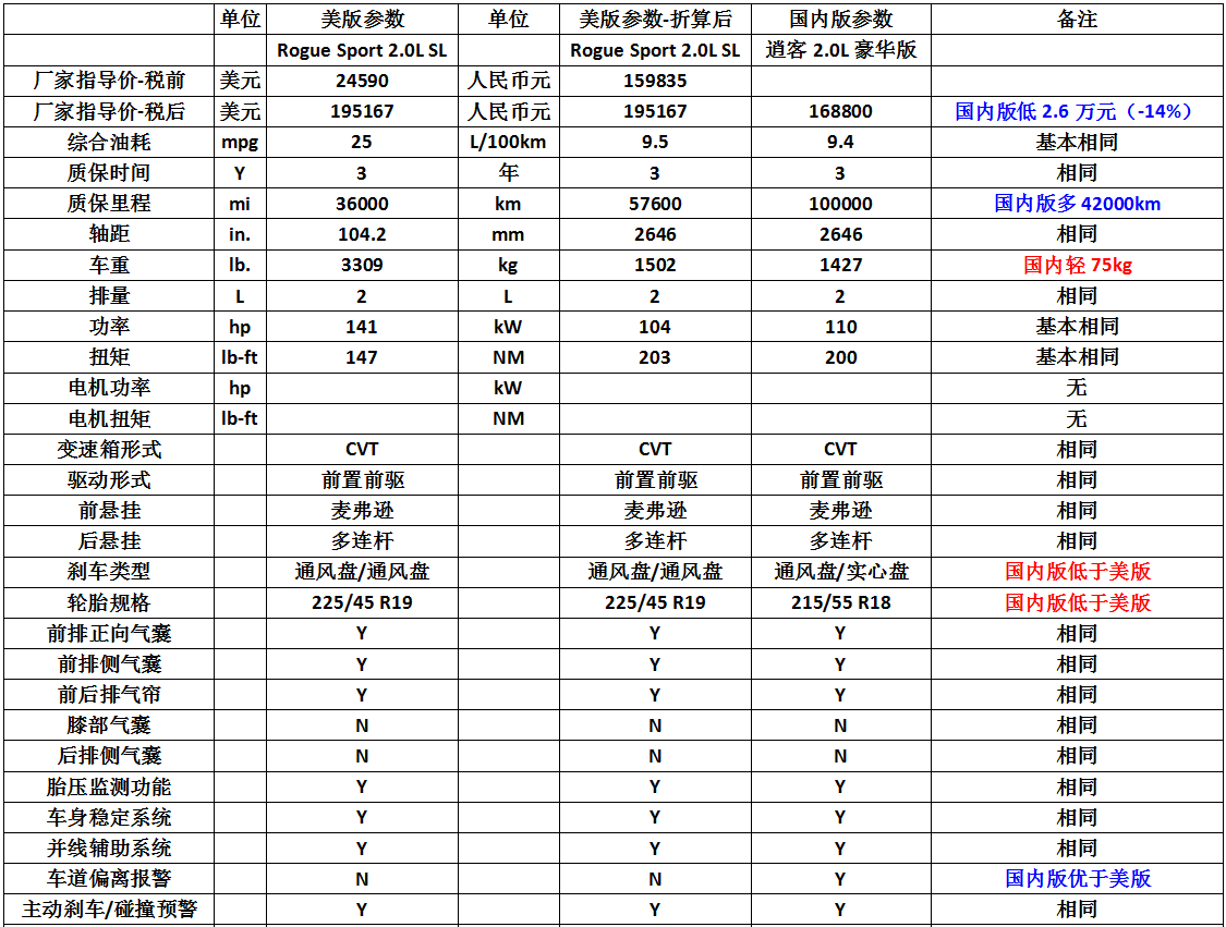 美版Rogue Sport 2.0L SL型与国内逍客2.0L豪华版参数对比见下表: